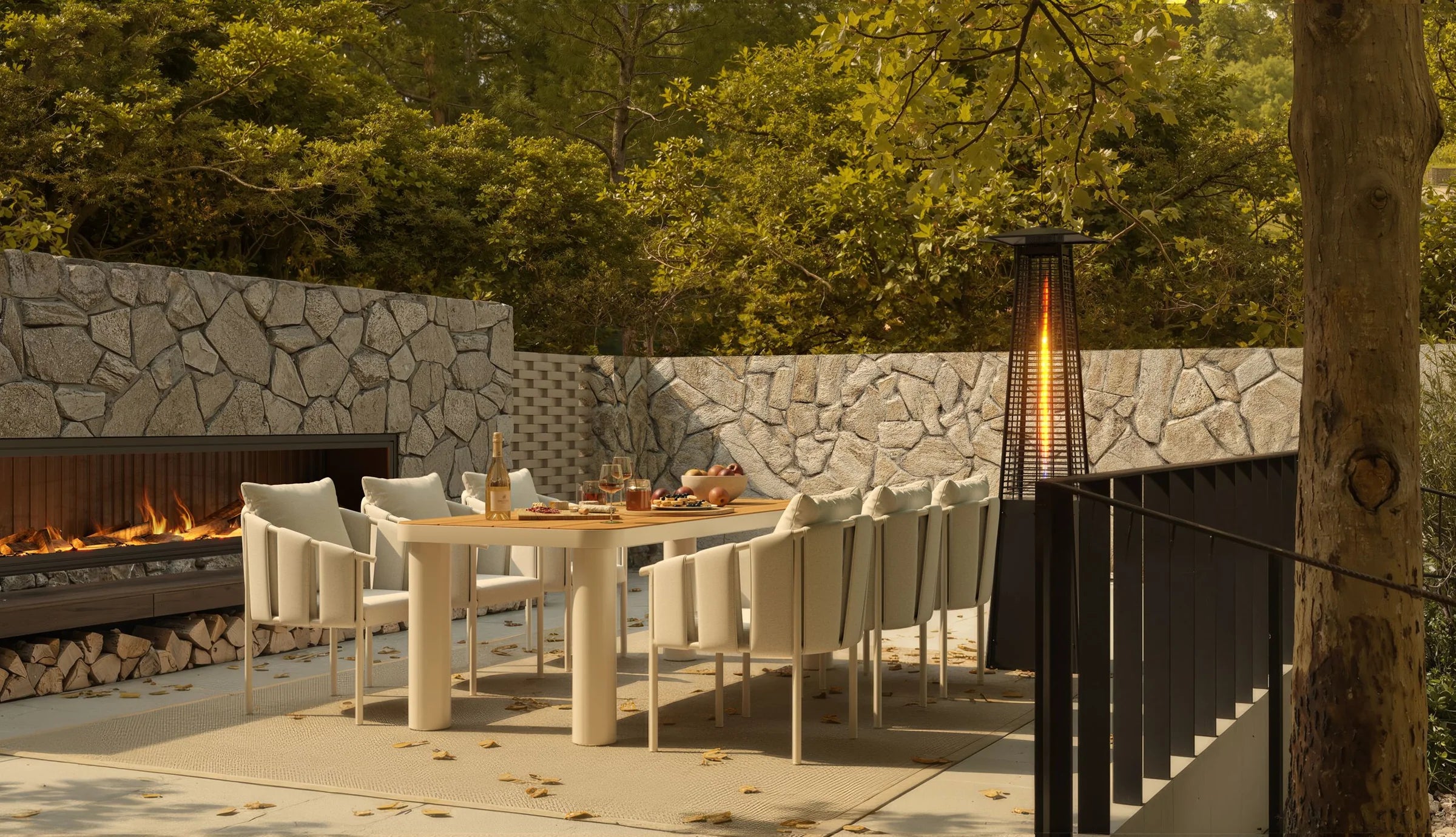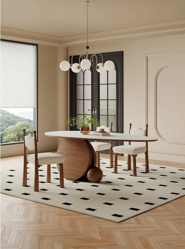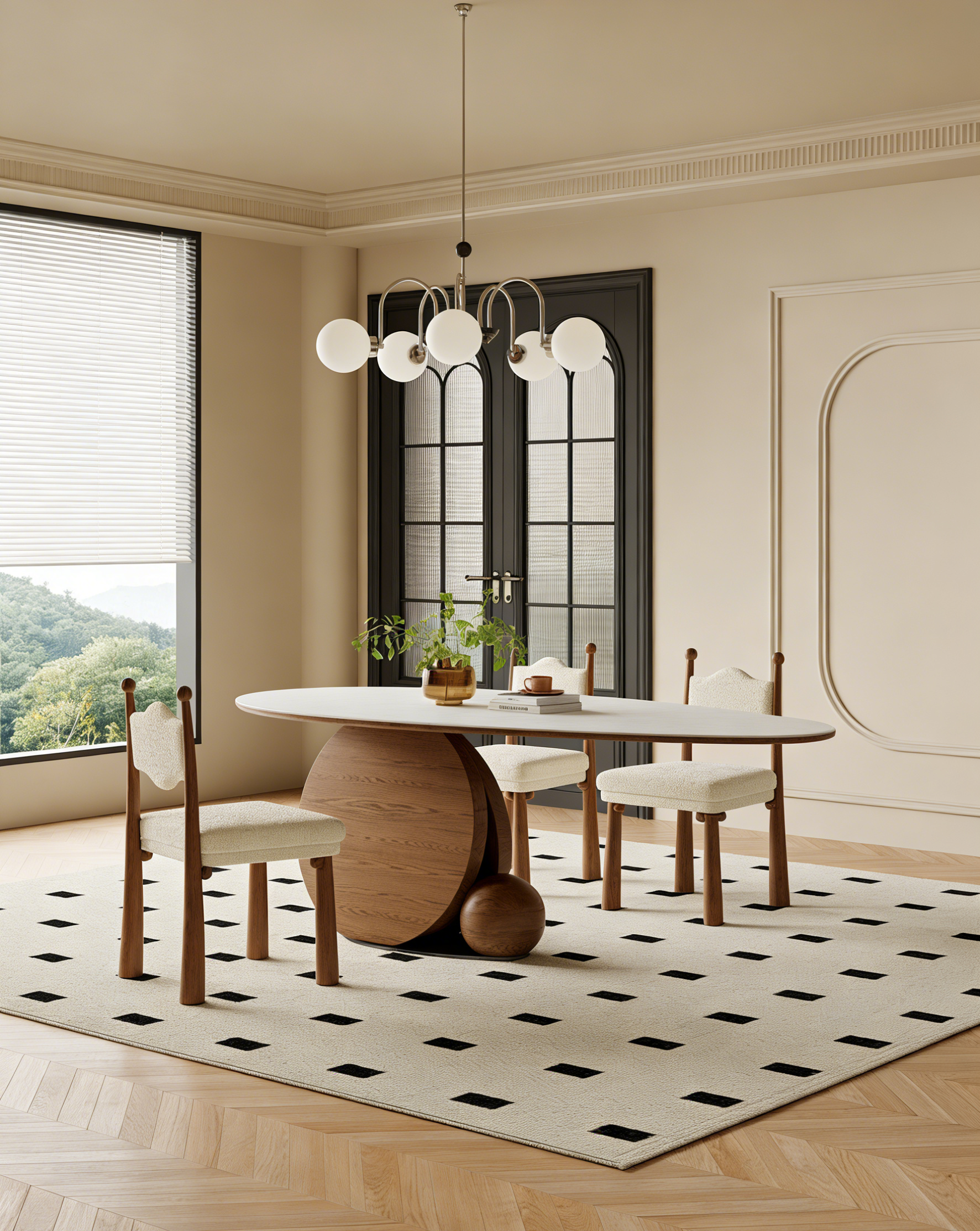 This dining table and chair set features a simple yet stylish design. The main structure uses a light-colored wooden frame, paired with off-white fabric cushions, creating a warm and natural atmosphere. The rectangular dining table has smooth lines and rounded corners, ensuring both practicality and safety.